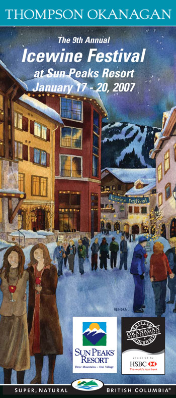 The Evans Gallery is co-hosting this event with the Wine Festival Society to display and offer for sale works they have collected over the years that have appeared on the cover of Wine Festival guides. The opening wine and cheese reception will be April 15th from 5:00pm to 8:30pm. Two of Kendra's pieces will be included; one that appeared on the Spring Wine Festival Guide cover in 2006 and the other on the 2007 Sun Peaks IceWine Festival brochure.